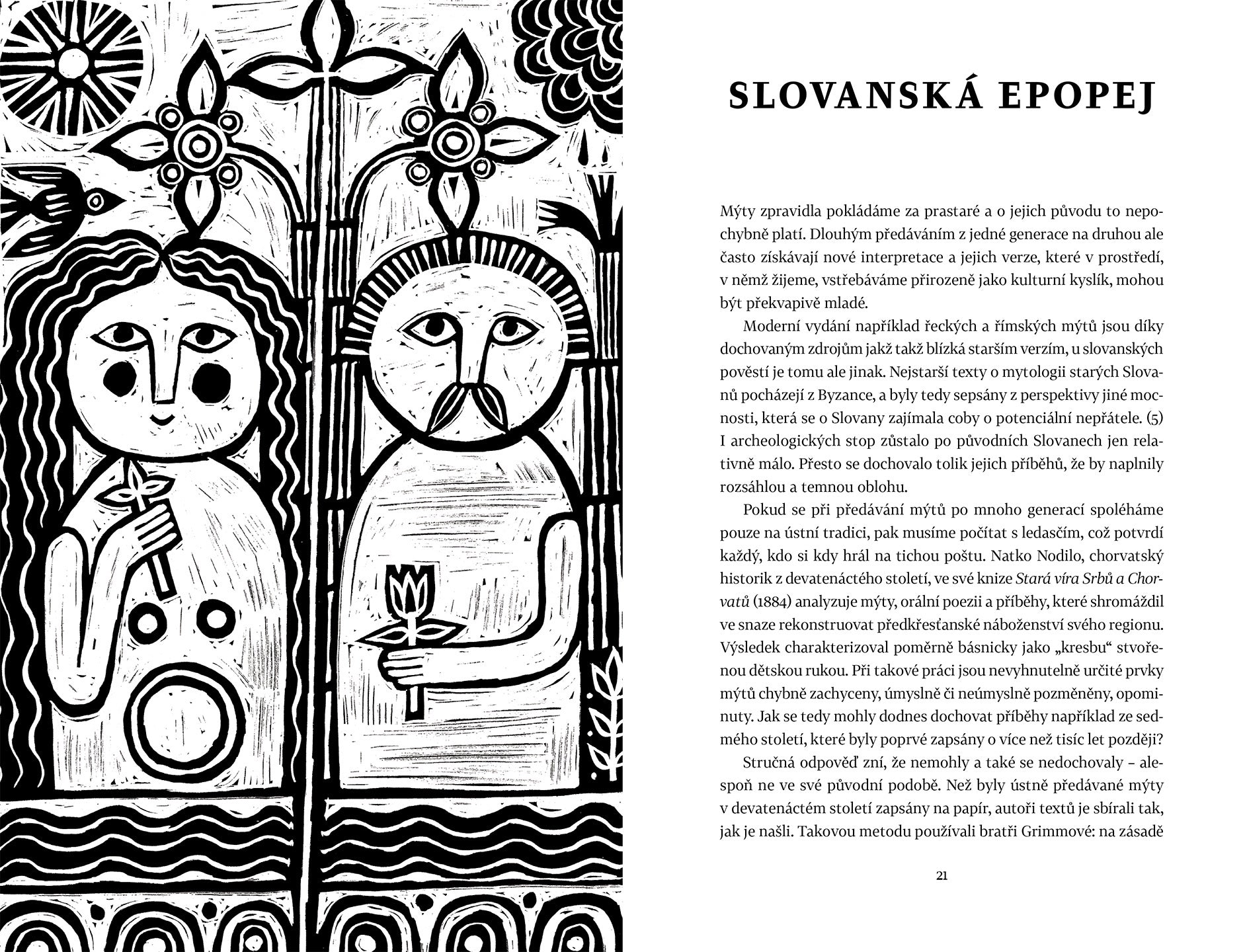 Slovinská antropoložka a lingvistka Svetlana Slapšak, narozená v Bělehradu a v r. 2005 nominovaná na Nobelovu cenu míru, a kunsthistorik Noah Charney, Američan žijící ve Slovinsku, společně napsali knihu, jejímž cílem je představit čtenářům význam i půvab slovanských mýtů a osvětlit historický a kulturní kontext těchto příběhů plných dobrodružství, kouzel, nestvůr a božstev. Autoři zkoumají původ vybraných mýtů, jejich podobnost s pověstmi jiných kultur i proměny, jimiž se na nich podepsal nástup křesťanství i pozdější práce učenců z 19. století, kteří zpravidla usilovali o podporu národního uvědomění. Vedle balkánských vampírů, vodních démonů, Ilji Muromce a nejvyššího boha Peruna se v knize setkáme například i s Libuší, Přemyslem a Slovanskou epopejí Alfonse Muchy. Příběhy a akademický rozbor jejich rozmanitých souvislostí doplňují působivé ilustrace ve stylu dřevořezů.