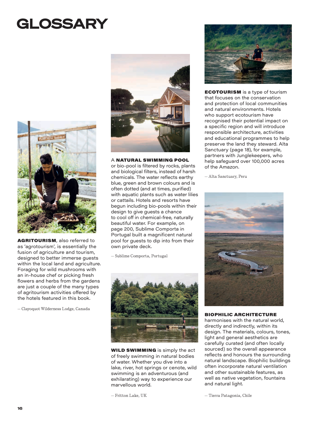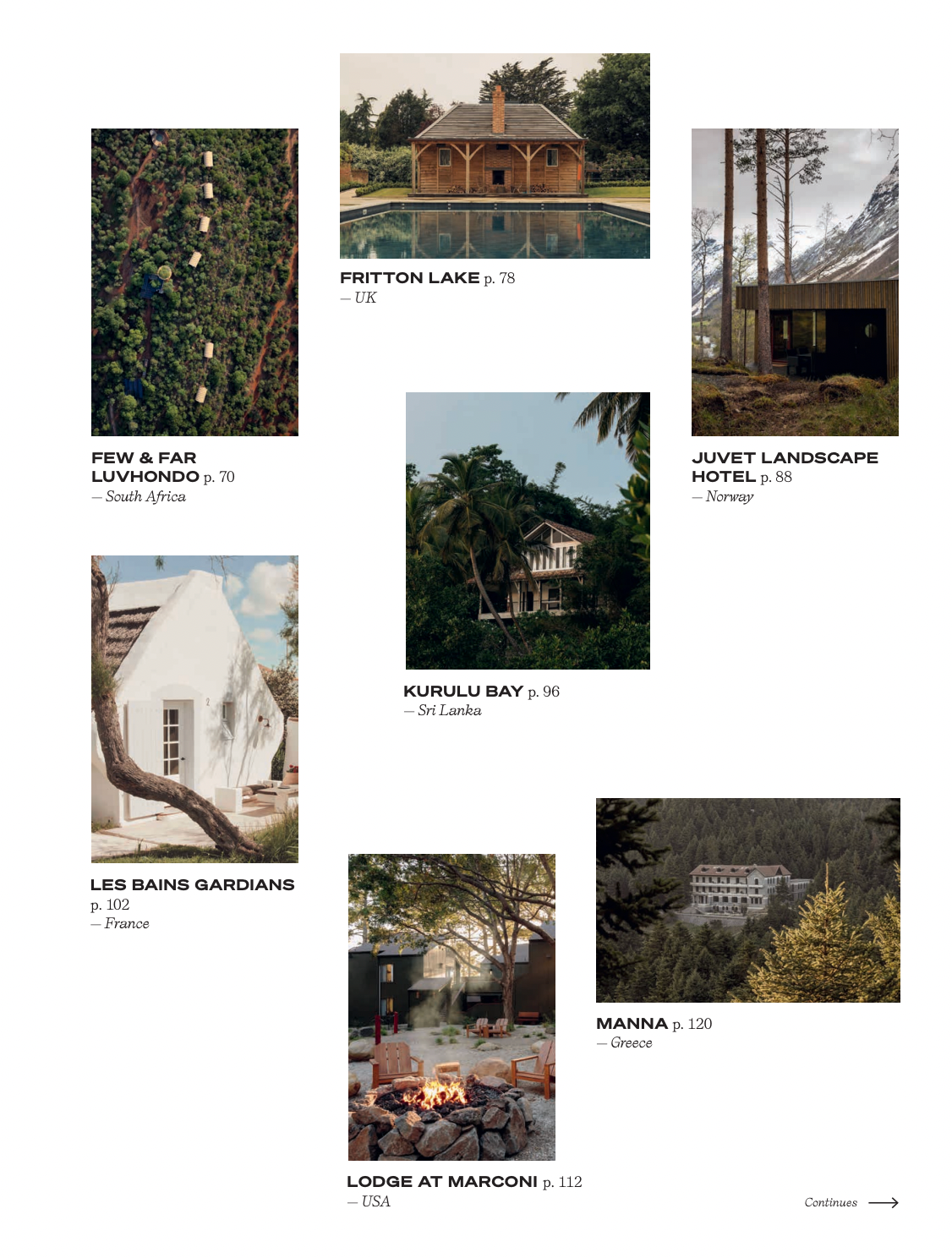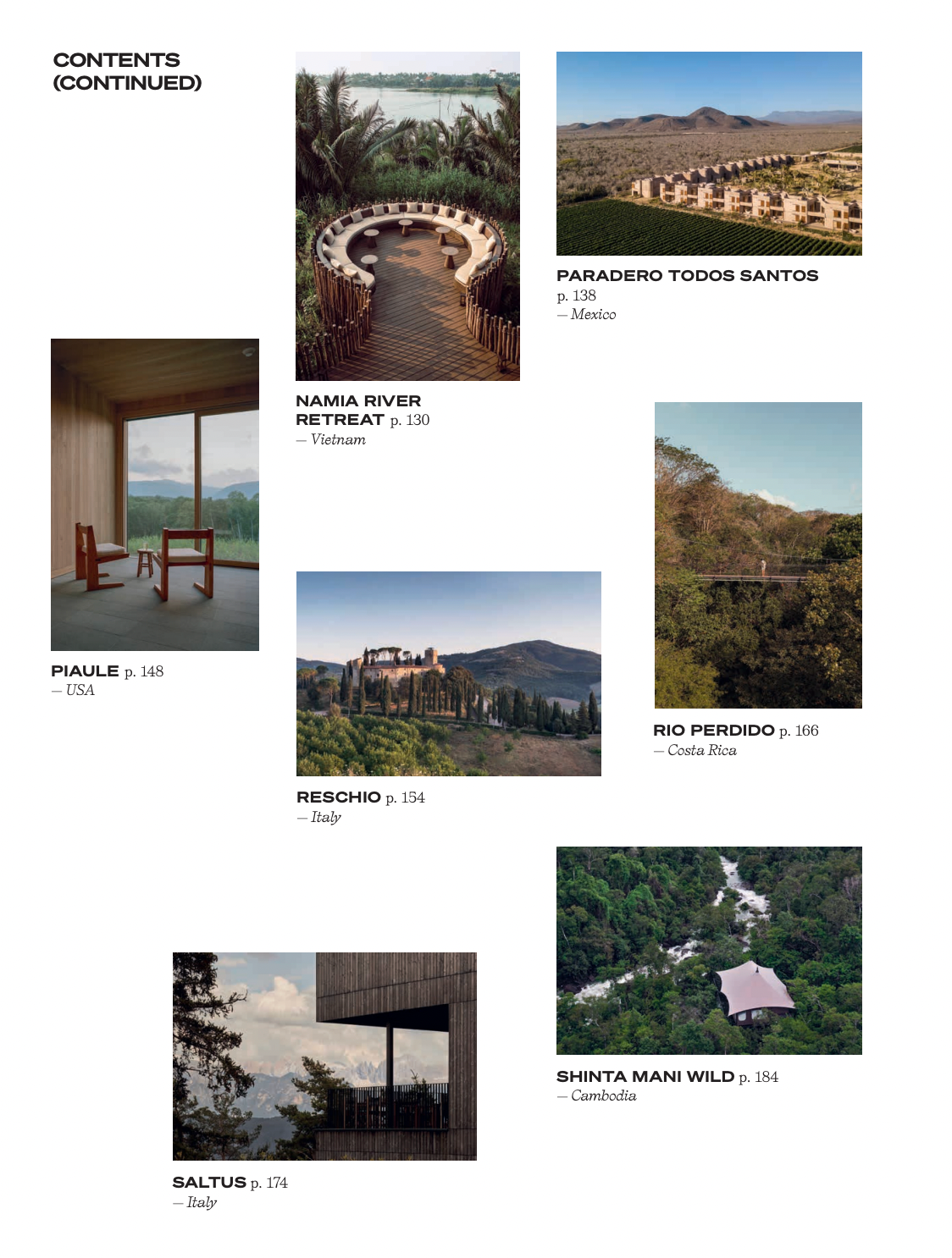 Each featured destination, spanning across six continents, has gently challenged the inorganic methods of traditional tourism. By introducing thoughtful architecture and experiences, they have made efforts to lessen their environmental impact and strengthen their guests' connection to the outside world, where majestic landscapes await to nurture the heart and ease the mind.
