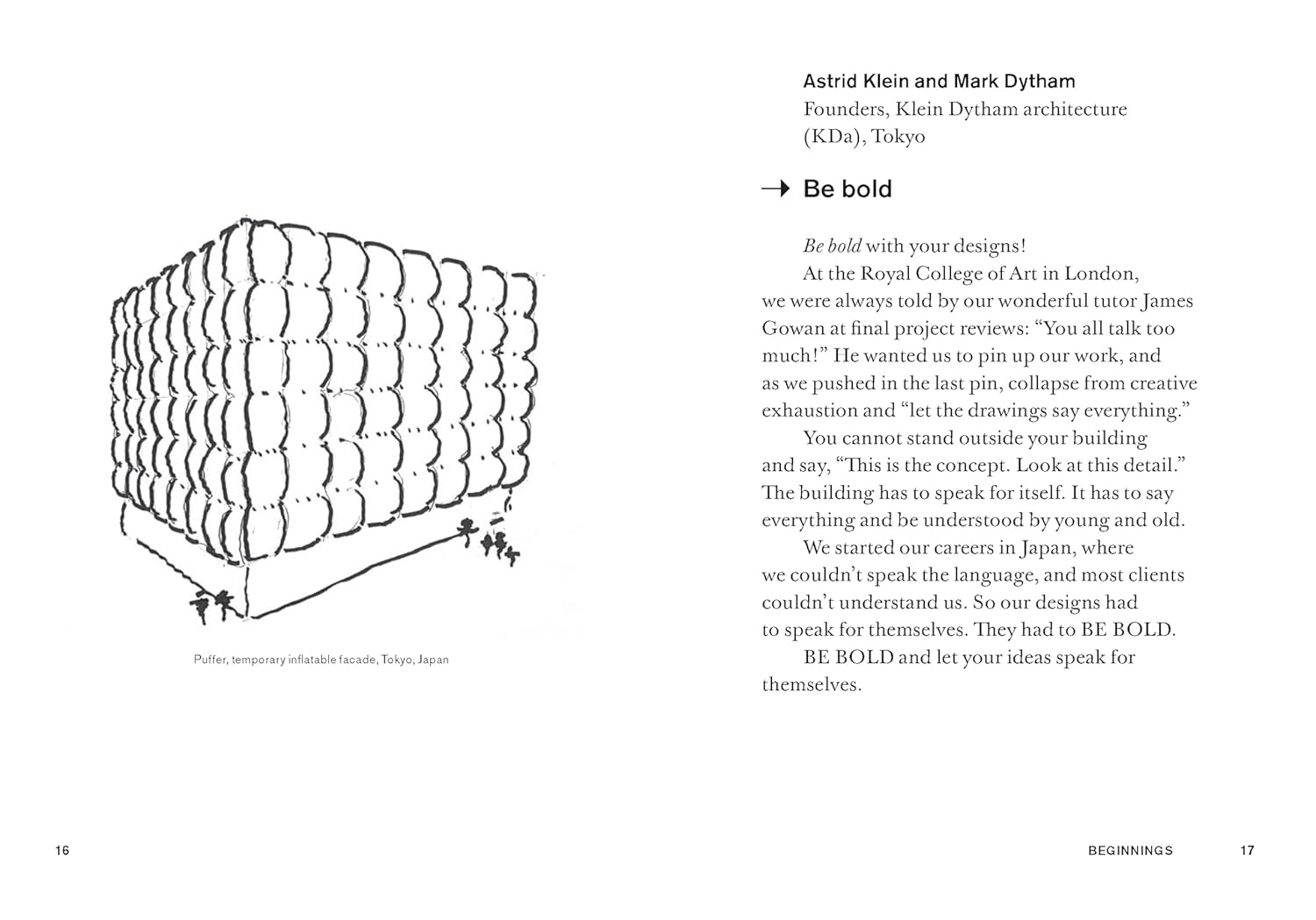 This book compiles more than sixty tips from a broad range of successful architects and design professionals from around the world. Organized by theme in seven broad categories—Beginnings, Inspiration, Values, Engagement, Process, Personal Development, and Determination—this book of advice offers thoughtful and thought-provoking guidance on such topics as: