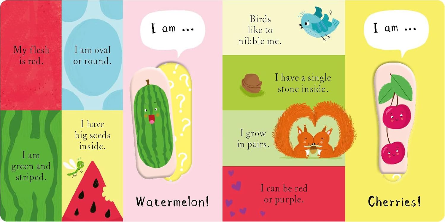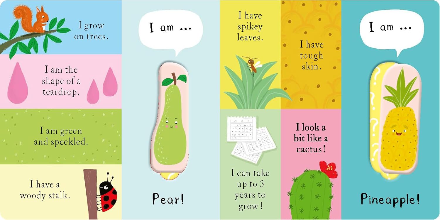 Pull out the sliding tray in the cover to reveal removable, double-sided fruit characters. Little ones will love following the clues to match the correct board piece to each page! Do you know which fruit grows in pairs? And which can take up to 3 years to grow?