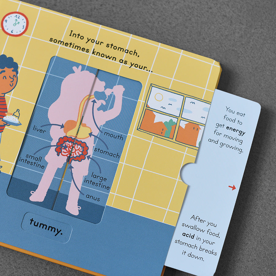Tug the tab to reveal all that hides in your insides. From nose to toes, there's plenty to discover with the magically dissolving windows in this bright board book.