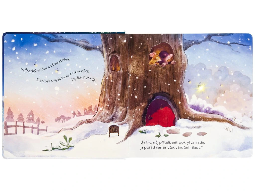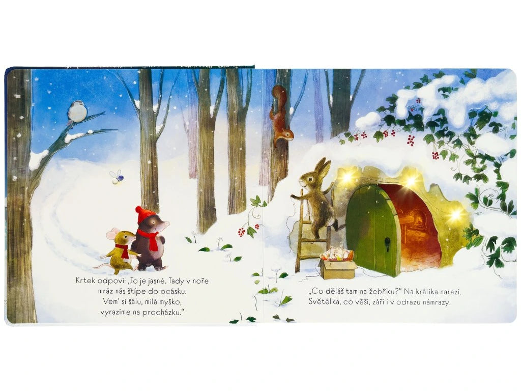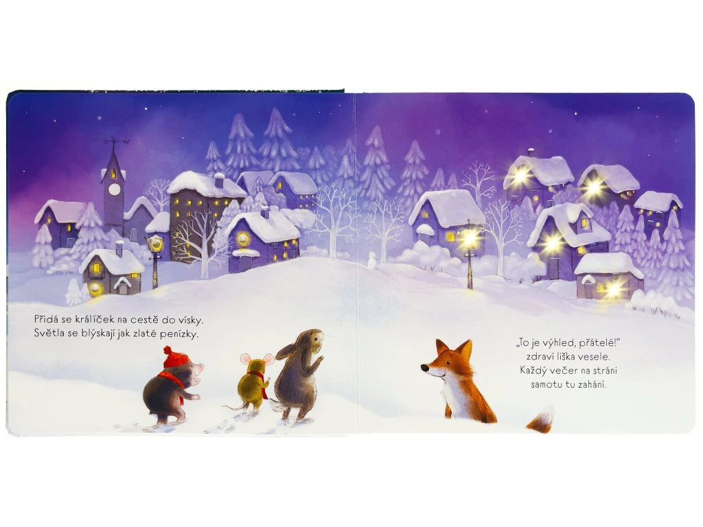 Spočítej světélka, lampy a hvězdičky, a nechej se překvapit stejně jako myška tím, co jí kamarádi z lesa přichystají na Štědrý večer pod oknem. Krásné leporelo se světélky na každé dvoustraně, která děti nejen zabaví, ale také jim pomohou uklidnit se a usnout. Myška s krtkem se vydávají na vánoční procházku, aby si zlepšili náladu. Po cestě potkávají další lesní zvířátka. Společně pozorují různá světélka, ať už jsou to hvězdy na nebi, ozdobný řetěz nebo lampy ve vesnici. Když se konečně vrátí z procházky domů, objeví před norou veliké vánoční překvapení. A co to je? To zjistíte na konci knihy i vy, když si prohlédnete všechny krásné ilustrace a spočítáte třpytivá světélka na stránkách tohoto leporela. Až se budou blížit Vánoce, předčítejte si s dětmi před spaním tento milý příběh o zvířatech a společně počítejte světélka. Vytvořte si tak uspávací rituál, který vašim dětem pomůže usnout a také si ukrátit adventní čas při čekání na Ježíška.